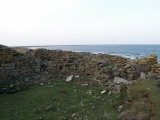 A broch on North Ronaldsay, Orkney, excavated by Dr William Traill in 1870. It shows two phases of occupation, and possibly a third - Celtic ecclesiastical. The wall is 4.5m thick, enclosing a courtyard 10m in diameter, with an entrance in the south-east and a wall cell in the north-east arc. A peculiarity of the construction is a 120cm high 'intake' above a ledge 90cm above the original occupation floor.