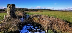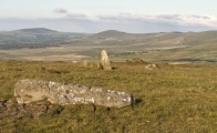 A Pair of Standing Stones in Co. Cork, one of which has fallen. Sited on a bog-covered hillside near the headwaters of Glashagarriff River. The north-eastern stone is prostrate; it measures 4.3m by 1.4m and 0.6m tall. The second stone stands 1.8m to the south-west in a townland boundary fence; it is 0.8m by 0.6m by 2.4m. There is a boulder-burial immediately to the south-west, see the nearby sites list on our page.