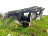 A well-preserved wedge-tomb in Co. Kerry, situated on a level terrace, towards the end of an elevated ridge which extends SW from Feaghmann mountain, Valencia Island. Local tradition suggests that the monument was altered for use as a shelter by a family in the nineteenth century, who were evicted. The monument consists of a short, unusually broad chamber covered by a single roof-stone. It is aligned ENE-WSW and is set in a low mound which rises to a height of .5m at the west. The chamber measures 3.5m long, 2m wide, and decreases from 1.25m in height at W to 1.1m at the east.