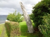 At Spansteigen, Hordaland, Norway is a very beautiful and slender standing stone. It is located at the edge of a private garden and surrounded by garden bushes. The area is a hill sloping down to the sea to the North. It has a beautiful view over the ocean. The stone is tall, around 4 metres in height. It is 70cm wide at the bast and around 30cm thick. It narrows toward the top that ends in a point. As you can see the stone is tilting to one side.