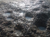 Cup-marked stone in the shallow water zone of the Parsteinsee at the second bathing area of the campsite E 24. The 1.7 m wide and 0.97 m high stone protrudes above the water surface and has about 40 cup-marks on its surface.