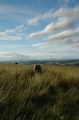 These stones near Blanefield to the north of Glasgow are located about 15 minutes north of a hillfort in the middle of the muir. They seem to be in a circle, consisting of 6 main stones, 5 of which are fallen or angled against the only upright. This last has a scalloped top very similar to the main upright at the Duntreath standing stones nearby at Dumgoyach. There is no record of these standing stones either on the main OS maps or the Canmore site. This area of the Muir is ancient and has not been farmed in a very long time indeed judging by the high tussocks of moss. Also, and more importantly, I noticed a rounded fern-covered feature some 100 yards from the stones. This stood out on the Muir and after inspection turns out to be a possible chambered cairn - again unmarked or recorded.
