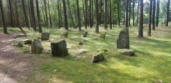 Gunnarstorp standing stones are part of a large Bronze Age and Iron Age burial site located along route 110 on the Oldtidsveien or 'prehistoric road' between Skjeberg and Fredrikstad in Norway. There is a sign along this road which leads you up a gravel lane to a car park from where you can walk uphill past standing stones and other stone settings which interestingly reflect the spirals seen in some nearby rock carving sites, then on past Gunnarstorp Cairn which is a massive 30 metre across and 3 metre high Bronze Age burial cairn. Continuing through the trees on a path for a further 350 metres you reach Gunnarstorp standing stones and burial site.