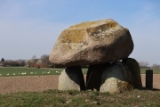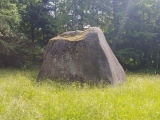 Megalitgrav (Burial Chamber) in Maribo. Approximate translation from Danish: The remaining mound is 11 x 7m and just 0.60m high. No kerbstones. Orientation is SW-NE. A few loose larger stones are seen at the NE-right corner of the right stone. Flint pieces were found on the floor of the chamber. Set of 5 supporting stones. Of these, 4 are good and large. Appears reconstructed.