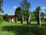Much more than a stone row here. This cemetery site consists of 25 barrows, one stone circle, one stone ship setting and the nine stone row (possibly 12 originally). Iron age; 400-600 AD