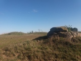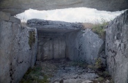 Further along the D.35 from Montmirat, just before the junction with the D.31, a decent sized tumulus can be seen in the fields on the left, about 80 metres from the road. The mound is oval, about 15m by 12m and up to 2m high. In the centre of this is a sort of double dolmen, with two joined chambers, each having two side slabs and a capstone. The western of the two has a backstone, while the eastern has a drystone walled end.