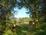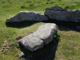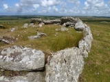 A kerbed cairn in North Cornwall. 13.0m diameter, almost totally enclosed by massive granite slabs - maximum size 3.3m long x 1.6m high - set lengthways and inclined to the centre. The centre core, 1.2m high, has been extensively disturbed.