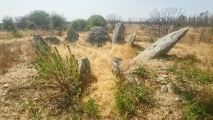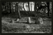 A circle of smaller stones with a pair of more significant standing erratics at its centre. These stones were the internal structure of a round barrow which was excavated nearby. So it is quite a rare possibility to study such a structure.