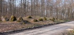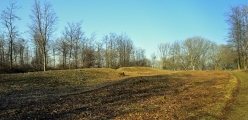 Langdysse (Long Barrow) in Præstø, Denmark. The long barrow is 50m long by 8 metres wide and 1 metre high currently. In the middle are two chambers. In the southern chamber, one of the capstones is visible.