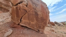 An easily accessible rock petroglyph site next to a wooden corral on Route 162, about 0.2 miles east of Bluff UT town center. The rock art, on a large boulder face at the end of the parking area, is a melange of horse images as well as elk and probably deer. All are in good condition.The horse images are from the historic period, as domesticated horses were not introduced until the Spanish arrived in the 16th and 17th centuries CE. There are also a few scattered abstract images that could be prehistoric.