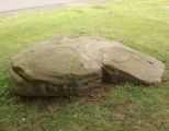 This rock art panel in a suburb of Shipley, West Yorkshire was moved to its current position during the development of a housing estate. It is recorded as having two cups with partial rings, a single cup and extended grooves. 'England's Rock Art' has more details, with a plan of the rock and its motifs, photogrammetry and a 3D model.