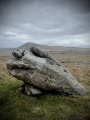 This propped stone sits at an altitude of 370m, the slab measuring 40cms thick, 80cms wide and 110cms long. The slab is made of Great Scar Limestone. This slab is placed on a low knoll; its precise origin is not immediately clear, but the stone matches both the scar above and a lower limestone pavement. There are no other similar slabs in the vicinity. There is one prop - an irregular piece of limestone - which supports the slab, which is smaller than in other similar features; it is also trapped by the slab against the bedrock at an unnatural angle.