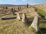 Scorhill stone circle and standing stone on Scorhill Down, northeast Dartmoor. Its dramatic setting on the rugged moorlands makes this 26.8m (88-foot) circle an especially worthwhile visit. Only thirty-four stones remain of an original sixty-five to seventy, and only twenty-five of those are still standing. Two cart-tracks run right through the ring, making its appearance even more dramatic. The stones are not evenly spaced, and the tallest, at 2.5m (8 feet 2 inches), is located in the NW. There is a prostrate massive slab,1.8m (6 feet) long and 1.5m (5 feet) wide, slumped at the SSW.