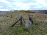 A disturbed Bronze Age round barrow on the summit of Foel Ddu, Powys. approximately 14 metre in diameter and 1.3 metre high. Also present is a 19th Century boundary stone, seen here in the foreground.