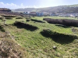 The remains of an ancient settlement on the slopes to the north above the stream which runs into Mawgan Porth. Now (or certainly back in the 1970s/80s) surrounded by a pitch and putt minigolf course, some of the remaining hut circles feature as obstacles on the course.