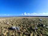 Trerathick Cove Kerb Cairn has large kerbstones, The lowest layer of the stony mound survives. It's 23 x 20m (75ft by 65ft) with an interior off centre hump of 1m (3ft 6in) high. Some of the white quartz kerbstones measure 1.5 by 0.6m (5ft by 2ft). The position of the kerbstones suggests that another smaller round barrow (with it's own small kerb) is attached on the eastern side of the main kerb cairn.