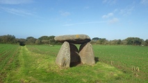 A pleasant dolmen towering high in a field. The capstone is sitting on three support stones (orthostats). At least some sort of passage must have gone missing. In a field of crops about 200 metres from the road, but with a signpost.