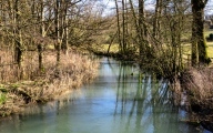 The chalky water of the River Kennet in full flood as it flows away from The Swallowhead Springs near East Kennet village. There are at least two spring outlets a few metres from each other. One has been decorated at some time since 1979 by the addition of small sarsen stones. More photos in all seasons, wet and dry on our page.