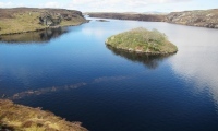 An ancient fort in Loch Hornaraigh, Isle of Grimsay (between North Uist and Benbecula). The causeway can be seen to the front right of the Dun, intact along all of its length, rising some 8 feet from the loch's floor.