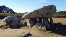 A double chambered and kerbed long-barrow, measuring 27m by 8m, oriented NNW – SSE. The large northern dolmen chamber has lost its capstone. Height would have been about 1.80m. The similar sized southern chamber is almost perfectly preserved.