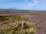 Located on the gently sloping ground of the western flank of Low Brown Hill / southern flank of Brown Hill and just over ¼ of mile north west of WHITE CROSS is an unusual bronze age funerary arrangement. The arrangement consists of a small standing stone between a round cairn to its immediate north east and a ‘D’ shaped enclosure to its immediate south west.