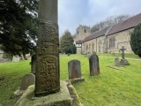 A partly restored decorated pre-Norman high cross constructed of local sandstone and located in the churchyard to the south of St Wilfrid's Church, Halton. The decoration on the shaft is of 11th century date; at the base are scenes from the Sigurd legend, an Anglicized and Christianized version of the story of St George slaying the dragon. At the top of the shaft there are emblems of the four Evangelists, St Matthew, St Mark, St Luke and St John, and below this are parts of four arched panels containing figures, but this part of the cross has been broken and lost. Protected inside the church is the Lancaster Cross, a 10th century Anglo-Saxon/Norse cross-shaft with a missing head but still quite spectacular detail.