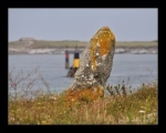 A leaning granite menhir about 1.20m. high on a mound beside the sea at Beg-ar-Galeti, Finistère. The northwest face has two rectangular grooves indicating an attempted demolition.