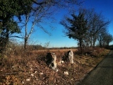 A pair of pillar-stones, which I would interpret as male and female, spaced 2.5 metres apart. The female stone has a large (and largely-natural) cup-mark with groove (artificially enlarged ?). M+F paired stones are rare in France if they exist at all (in Brittany ?) though there are several in Ireland.