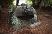 A drought was one of the severest disasters on the Okinawan islands, along with frequent typhoons. The Kume-jima islanders’ legend tells that during a long drought, a cow ran away into a wood then the farmer found the cow drinking the water in the hole of this stone. Following this the islanders offered prayers for rainfall here and they were rewarded.