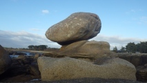 A large erratic stone in Finistère, called locally "Beg ar Gazeg". Could this be a human-propped stone or proto-dolmen, there are certainly many dolmens and burial chambers in the area. Presumably it would be too heavy to be moved by the waves? Thoughts anyone? [MegP Ed]