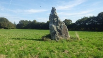 A 4.8 meters tall menhir with veins of quartz. Between the D 29 and C 27 roads, at Carn Bihan hamlet near the village of Loperhet, Brest.