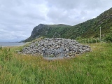 At Gåsneset (Møre og Romsdal, Norway) there are six burial cairns. Two of the cairns are large, over 20 metres in diameter. They are located just west of the local road between the road and the shoreline. The terrain is grassy and has some moss but very low vegetation and the largest cairns are easily visible. The site has an information board next to the local road and a small parking place.