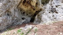A rock shelter / overhang on the border of the former Münsingen military training area in Baden-Wuerttemberg. There have been finds from the Middle Stone Age, Bronze Age, Iron Age and Middle Ages and there is an old information plaque attached.