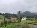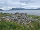 This cairn is located in an almost flat area with some grass and ferns overlooking the sea to the west. The coastline along Stongfjorden has several pretty cairns and also rock art panels. A footpath goes parallel to the local road along the shore and passes several other sites. The cairn is built around an large natural block of stone which is oriented North West-South East and is 4m long in that direction.