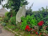 A menhir moved into the entrance of the yard of a farm. Its current height is 2.50 m, width 1.80 m, thickness 0.80 m. The name of the farm is engraved on the stone (!)