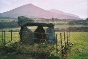 This dolmen, with a thin wedge-shaped capstone supported on 4 stones, is in a farmer's field with views down to the sea, and over to the hills Yr Eifl with its hillfort Tre'r Ceiri.