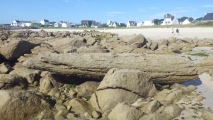Most likely a fallen menhir. Located between the boulders on the coast of Sainte Evette. About 6 meters long and only visible at low tide.