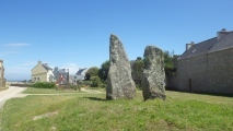 On a grassy mound at the south-west side of St Guénolé’s church on the I’le de Sein (Sein Island) – five miles off the Finistere coast at Pointe du Raz (Bretagne), Brittany, are two tall granite standing stones (menhirs) that may have once been part of a stone circle. There are a number of myths and legends associated with these menhirs, the island known as Enez Sun in Breton has long been steeped in pre-Christiand myths and druidic ritual.
