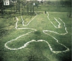 A man-shaped effigy mound in a park 4 miles (6km) NE of the town of Baraboo, Sauk County, Wisconsin. The figure is about 64 metres by 16 metres and part of this mound has been destroyed where the nearby road has cut through the effigy's legs.