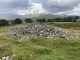 Lagwine Cairn is located c. 0.5 mile N of Carsphairn in Dumfries and Galloway. According to Canmore, the oval cairn originally measured 30.0m E-W by 25.0m N-S. There has been some stone robbing, probably for the construction of a sheepfold c. 50 yards NE of the cairn. However, a ridge of apparently undisturbed stones survives,