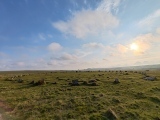 On open moorland just south of Stannon china clay works, and seen from the road, this is a large uneven circle with between 70 and 80 remaining stones, and a diameter of between 40 and 43 metres. In places the stones are very close together and seem to touch, but in other places they are well spaced.