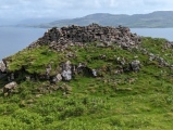 A fine example of a galleried dun in a conspicuous position on the summit of a low rocky knoll some 600m SSW of Burg farm-house, Isle of Mull. It is almost exactly circular on plan, measuring 10.4m in diameter within a stone wall which measures 2.3m in average thickness.