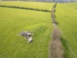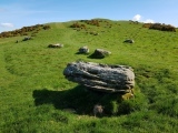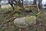 Walking to the main group of tombs at Loughcrew brings close proximity to these remains near where the path changes direction abruptly. The Historic Environment Viewer States: 'This cairn is designated P2 by Conwell (1866, 370; 1873, 65) who describes it as six large stones, one of which (L 1.9m; dims of base 0.7m x 0.4m; max. dims 1.7m x 0.6m) had cup-marks on the E face, although he thought that they might be solution holes, which they are.'
