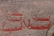 Just across the E6 from Solberg in Norway is Hornnes - another rock art site on "The Prehistoric Road". 21 ships on an almost vertical rock face all pointing east to the sea (and the rising sun). The detail is so clear that it is possible to date them to the late Bronze Age from their design. The site signs here link such ships with the passage through life and on into the next world.