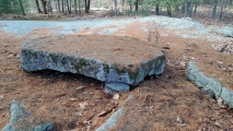 This is a large, very heavy table-like slab, supported by several small stones on a ledge. In Foxboro state forest, site D on the published map. The slab is elevated no more than 6 to 8 inches (15 to 20cm) off the ledge surface. Still, it must have taken considerable effort to manoeuvrer the slab onto its supports.