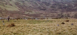 This circle of low stones under the slopes of Tal y Fan near Conwy is good to visit, though not easily seen until you are actually standing by it. There are a couple of outliers associated with the circle and a cairn also.