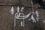 Kville 151:1. Hällristning. Rock Art. Photos from the working Seminar in August 2023 at Tanum's Hällristningsmuseum Underslös. The figures are illustrated with chalk paint - two rare fishing scenes, human figures, animal figures, ship figures, circle figures and cupmarks.