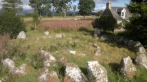 Stone Circle and kerb cairn in Highland. Carn Urnan, a kerb cairn within a stone circle, lies in the corner of a garden of a croft house. Seven stones remain of the outer circle, three of which have fallen. All are well over a metre in height. There are gaps to the south-west and north-north-west indicating there may have been more originally.