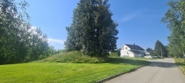 In Hedmark, Norway - just next to a garden and at the east side of a small grassy park is a beautiful iron age round barrow. The barrow was previously damaged but was restored by a local historical society in 1970. Close by is a memorial stone from WW2.