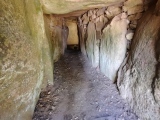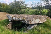 A dolmen situated in a barrow. The chamber consists of three stones covered by a heavy capstone and surrounded by a circle of slabs set on edge. This type of tomb was built in the Early Stone Age, c 2500-2300 BC. No finds of the period of construction have been made here. Dolmens are associated with the introduction of farming in Sweden. The cup-marks on the capstones are probably of a later date - most likely the Bronze Age.